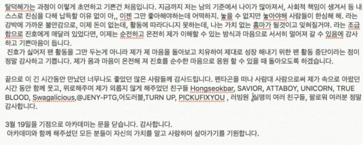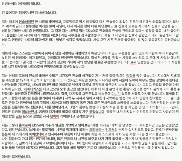진호가 싫어져 팬 활동을 그만 두는 게 아니라 제가 제 마음을 돌아보고 치유하여 제대로 성장해내기 위한 팬 활동 중단이라는 점이 정말 감사하고 기쁩니다. 제가 몸과 마음이 온전해져 진호를 순수한 마음으로 응원할 수 있을 때 돌아오도록 하겠습니다.