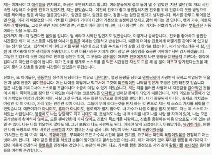 진호는, 또 아이돌은, 뚱뚱한데 성격이 당당하다는 이유로 나댄다며, 얼평 몸평을 당하고 왕따당하며 사랑받지 못하고 억압당한 우울한 제 삶에 한줄기 빛이었습니다. 저는 나이를 이렇게나 먹고서야 그것에 의존적이던 나약함 같은게 조금은 단단해진 것 같습니다. 많은 시간을 거치고서야 스스로를 조금이나마 소중히 여길 수 있게 되었습니다. 저는 저를 둘러싼 차별과 내 자존감을 갉아먹던 것들이 사회가 폭력적으로 정의한 '가치있는 여자'라는 코르셋임을 인식했고 벗어날 준비가 되었기 때문입니다. 저의 외모는 남들에게 있어 가치없는 여성의 상징이지만, 사실 그것을 무기로 저는 틀린 인간으로 몰아졌을 뿐입니다. 제가 잘못된 게 아니라, 실제로 가치없는 여성인 것이 아니라, 가치 없는 인간인 것이 아니라. 그들이 무례하다는 것을 인지 하는 것만으로 저는 제 스스로 가치를 되찾을 수 있었습니다. 예쁜 여자가 아니어도, 홈마가 아니어도, 팔로워가 많지 않아도, 내 가수가 내 이름을 알지 못해고 저는 제 스스로 가치 있는 사람입니다.