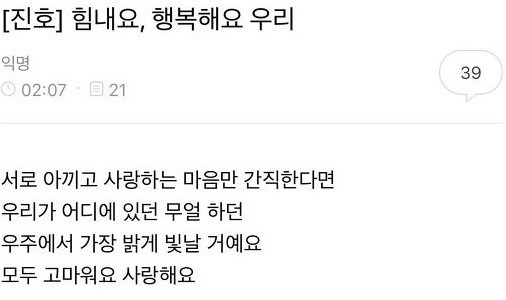 한계까지 와보지 않았다면 몰랐을 겁니다. 뭘 바라고 시작한 일인지도 잊었습니다. 이렇게나 공허합니다.. 진호를 좋아하고 응원한 시간동안 제가 제 스스로를 사랑한 역사가 없음을 이제는 인정하고 반성합니다. 때문에 더이상 진호에게 어떻게든 관여되어 있고 싶다는 생각은 없고, 집착하지 아니하고 저를 위한 시간에 조금 힘을 주기로 나의 삶을 되찾기로 했습니다. 제가 망가뜨려온 제 삶, 이젠 제 앞가림에 대한 생각들이 진중합니다. 이런 마음가짐은 저에게 있어 큰 성장임을 조금만 이해해주시면 감사하겠습니다. 그동안 건강하지 못한 마음으로 진호를 응원한 것이, 그 우울과 공허함이 어쩌면 진호에게도 나쁜 영향을 끼쳤을지 모른다는 생각에 겁이 나고 미안한 마음이 듭니다. 제가 진호를 핑계로 스스로를 좀 먹은 시간동안 자신도 모른채 참 많이 아프고 망가졌다는 것을 깨닫지 못하고 진호를 원망한 시간들이 있었을까 두렵습니다.
