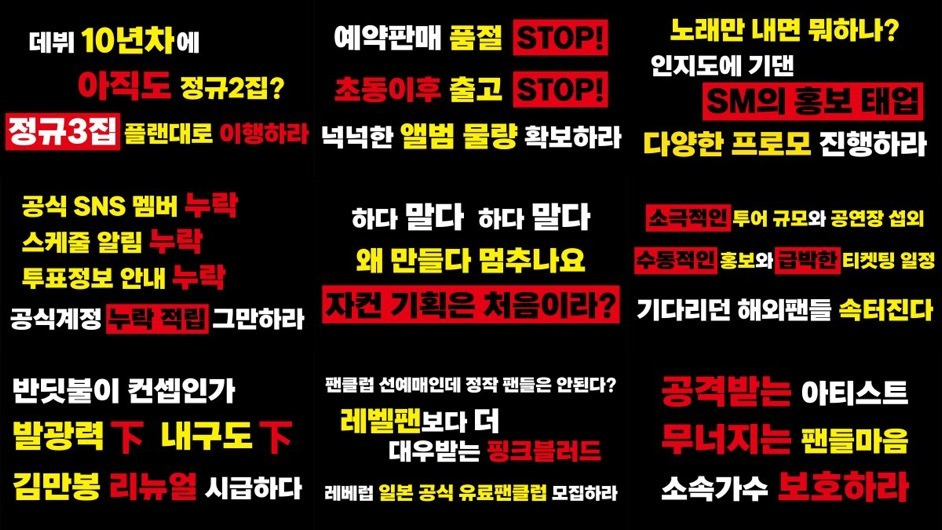 팬들은 정규 3집 앨범 발매, 자체 콘텐츠 제작, 앨범 예약 판매 수량 확보, 응원봉 리뉴얼, 다양한 프로모, 공식 계정 관리, 일본 유료 공식 팬클럽 모집, 해외 투어 문제점 개선, 아티스트 보호 등 9가지 항목을 소속사에 요구할 계획이라고 밝혔다.