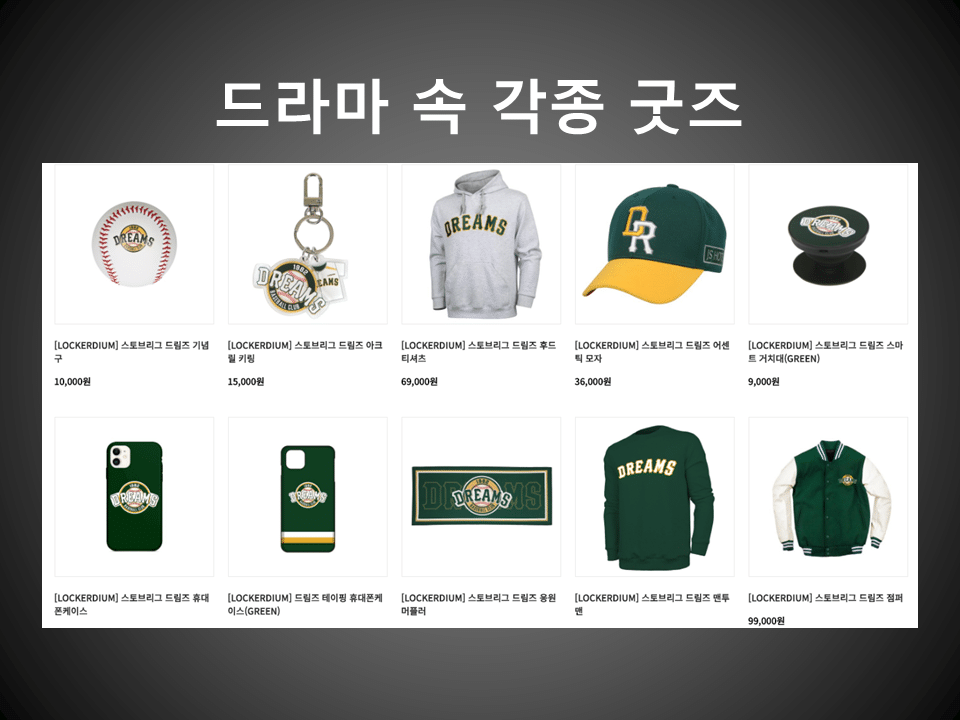 우리 드라마는 야구팀을 소재로 하여 SK와이번스와 협업한 다음, 정식 굿즈를 낸 드라마입니다.