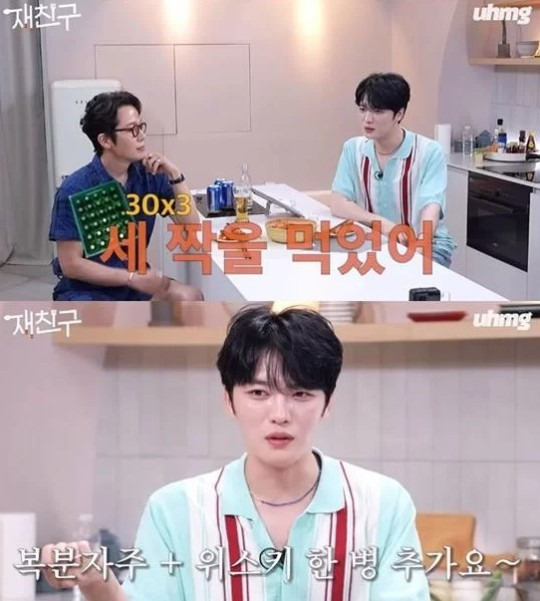 김재중은 "옛날에 부산국제영화제 때 부산 기장에 간적이 있다. 그때 7병 반을 먹었는데 2차로 해운대로 옮겼다. 거기서 30병 들어있는 한짝을 총 3짝을 먹었다"며 "90병을 다 채우고 숙소 들어가서 냉장고를 열었는데 복분자 한 병이랑 국산 위스키 한 병이 있더라. 그것까지 다 먹고 잤다"고 고백했다.