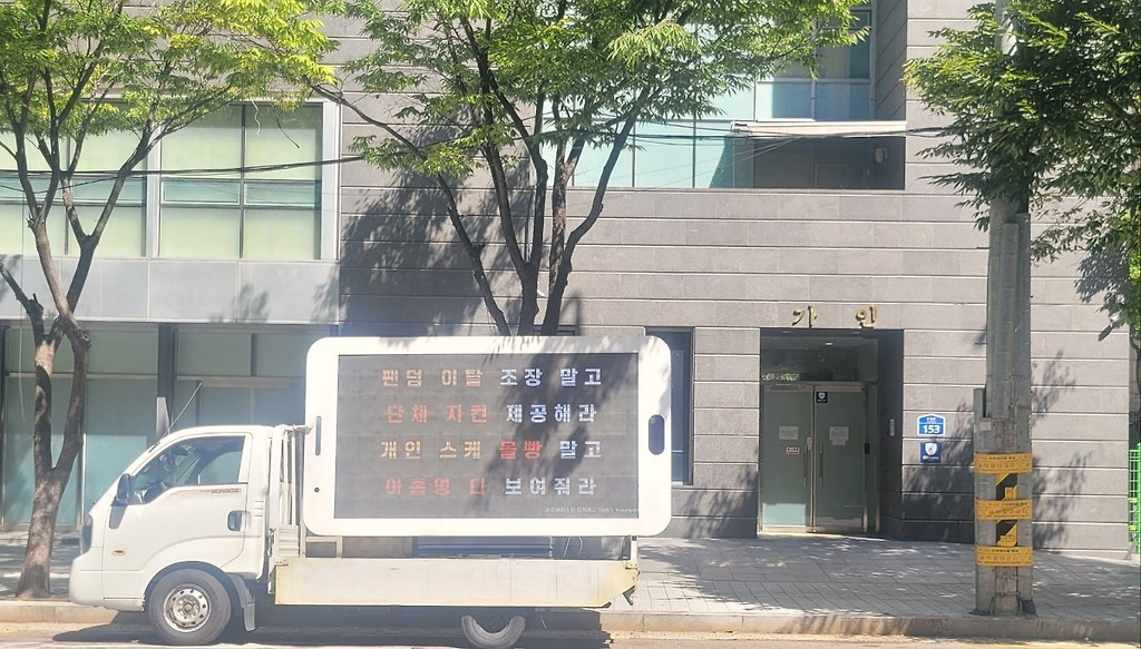 8일 오전 제로베이스원의 소속사 웨이크원 앞에서는 현재 소속 아티스트인 제로베이스원의 스케줄에 대한 시위를 진행 중이다.