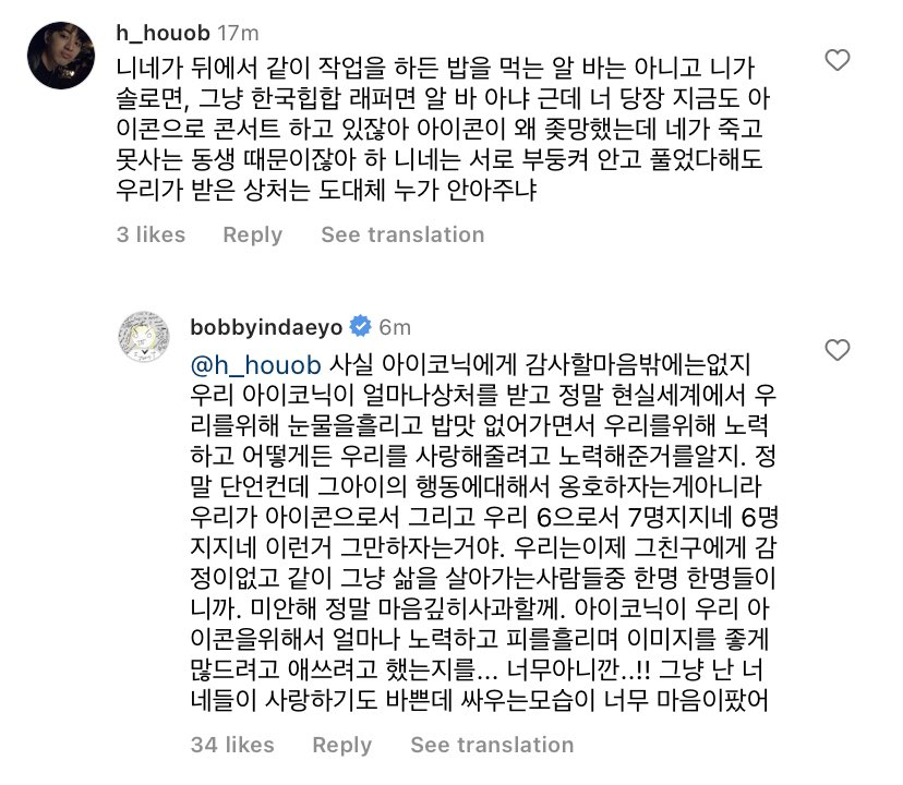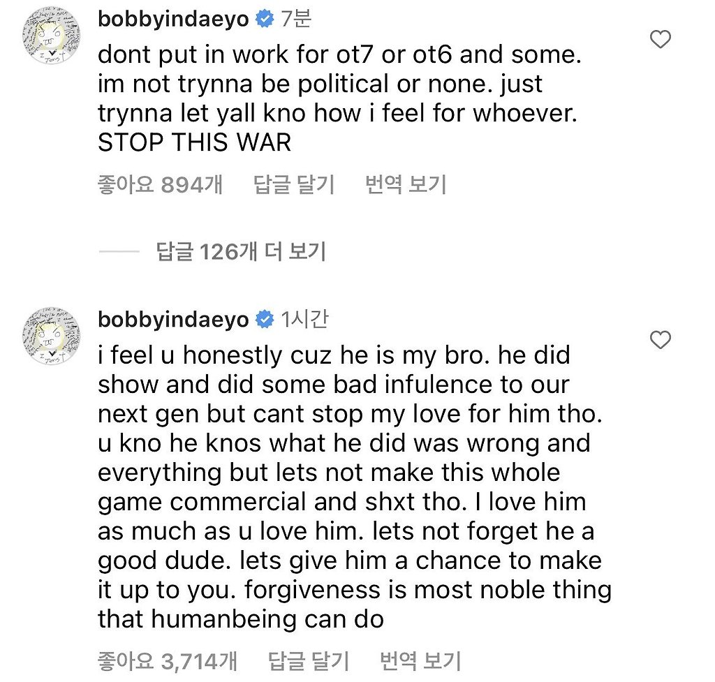 번역:걘 내 형제고 나도 너희들 기분을 이해함 후배들에게 나쁜 영향을 끼쳤지만 그래도 난 여전히 걜 사랑함 걔도 자기가 잘못한 걸 알고있어 모든걸 상업적으로 생각하지 말자고 난 팬들이 사랑하는 만큼 걜 사랑함 걔가 좋은 친구인걸 잊지말고 반성할 기회를줘 용서는 인간이 할 수 있는 가장 고귀한거임 이건 7인 지지나 6인 지지에 관한게 아니고 정치적으로 이용하려는것도 아님 그냥 팬들을 이해한다는거임 이 논쟁 멈추길 바람