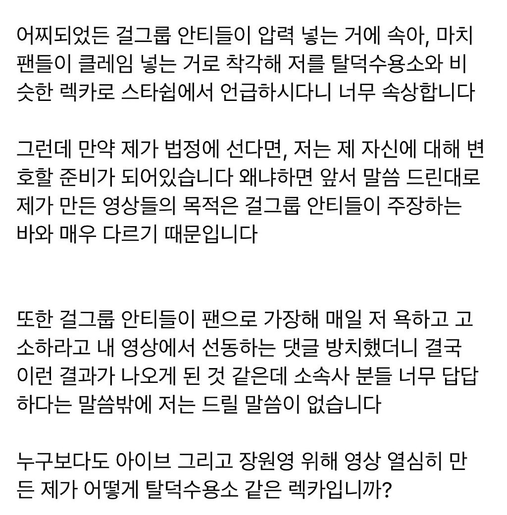 어찌되었든 걸그룹 안티들이 압력 넣는 거에 속아, 마치 팬들이 클레임 넣는 거로 착각해 저를 탈덕수용소와 비슷한 렉카로 스타쉽에서 언급하시다니 너무 속상합니다