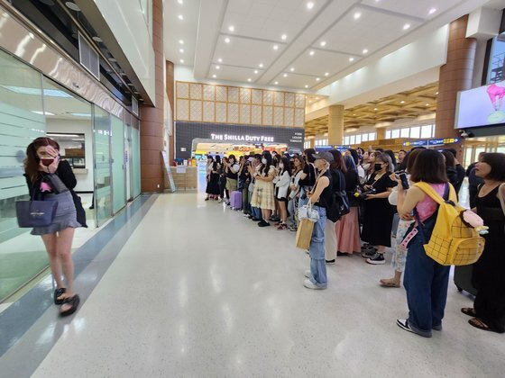 지난 9월 8일 오전 서울 김포국제공항 출국장 면세점에서 일본 공연을 위해 출국 심사 중인 JYP 보이밴드 스트레이 키즈가 게이트를 통과하길 기다리는 사람들. 일부 팬들은 좋아하는 아이돌을 잠깐이라도 보기 위해 비행 정보를 캐내 함께 탑승하고 찍은 사진을 팔기도 한다. 전영선 기자