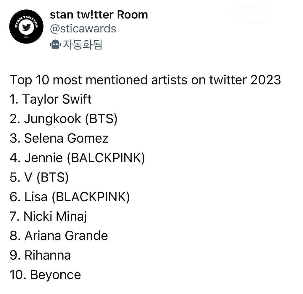 2023년 트위터에서 가장 많이 언급된 아티스트