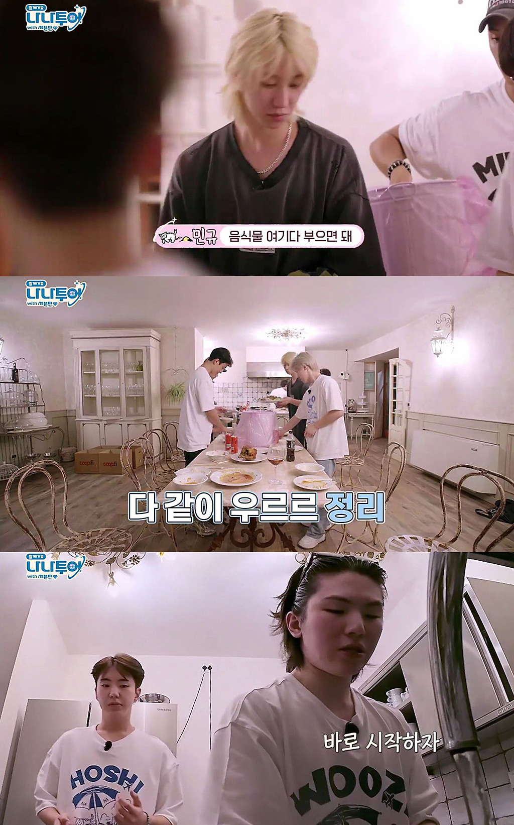 어디선가 음쓰통 가져오는 민규와 바로 뒷정리 들어가는 멤버들