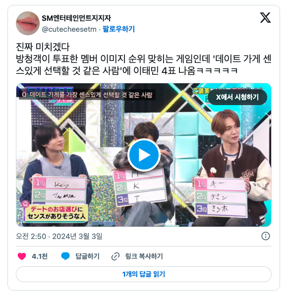 샤이니 멤버 중 데이트 가게 센스있게 선택할것 같은 사람 순위.