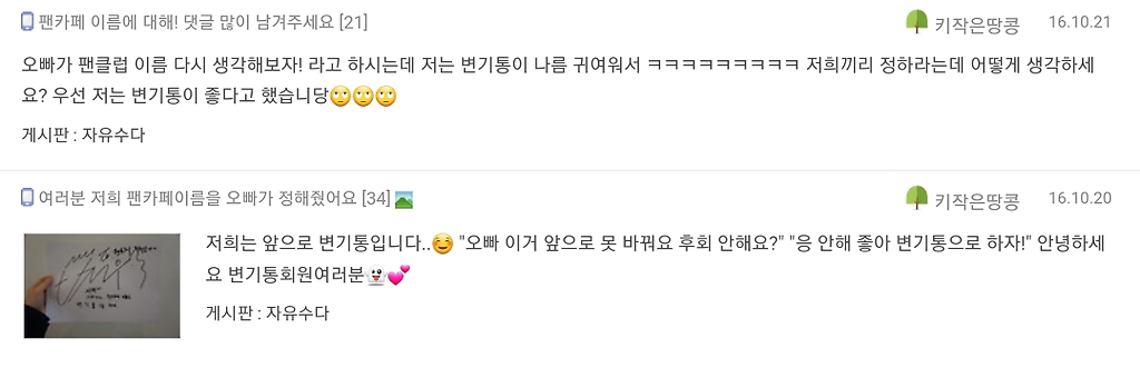 2016년 10월 20일 팬이 팬카페 이름을 지어달라고 했고