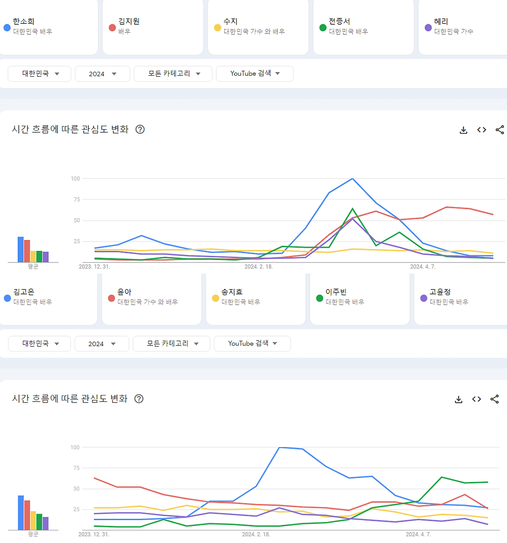 2024년 현재까지 국내 유튜브에서 가장 많이 검색된 여자배우 TOP10
