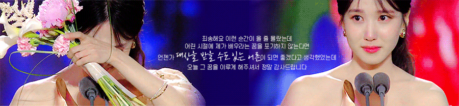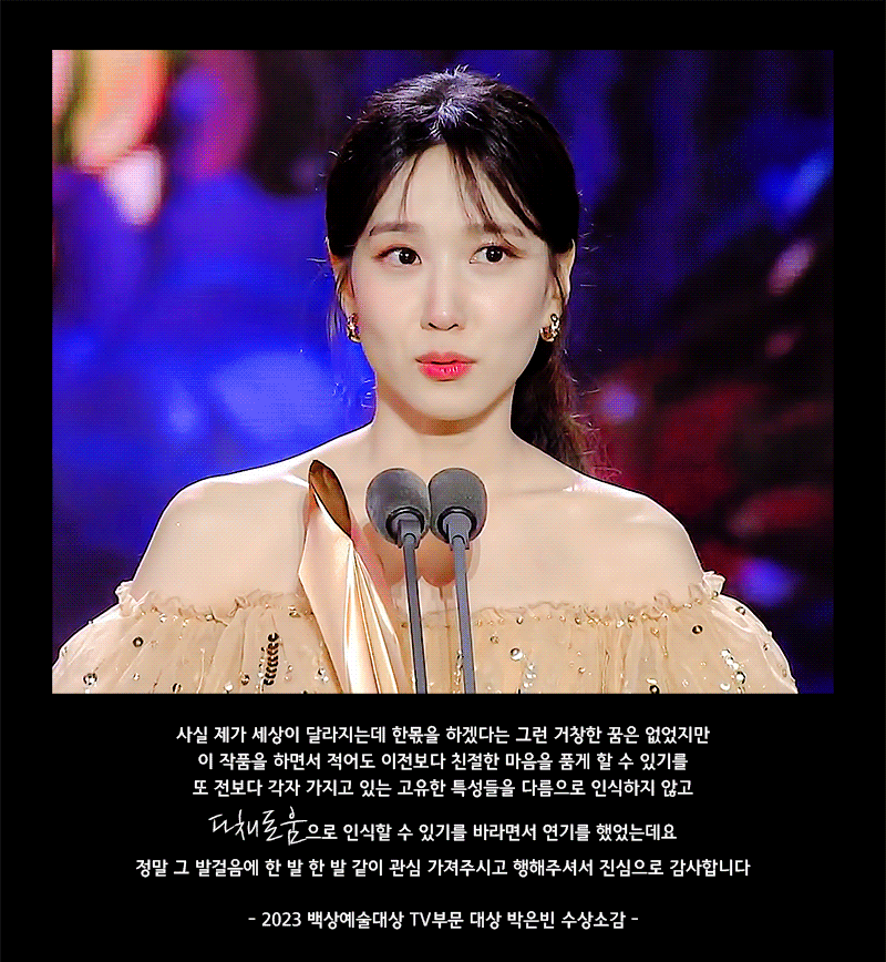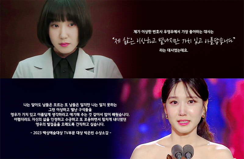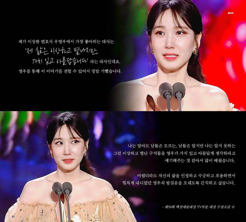 아마 이상한 변호사 우영우를 사랑해 주신 많은 분들 덕분에 제가 상을 받게 된 거 같은데요. 우선 우영우를 시청해 주신 모든 분들께 진심으로 감사드립니다. 모두의 기대 이상으로 정말 많은 사랑을 받았고 또 관심을 받았는데요. 사실 여러분의 사랑이 없었다면 제가 이 자리에 있지 못했을 것 같습니다. 죄송해요 이런 순간이 올 줄 몰랐는데 (ㅠㅠㅠ) 어린 시절에 제가 배우라는 꿈을 포기하지 않는다면 언젠가 대상을 받을 수도 있는 어른이 되면 좋겠다고 생각했었는데 오늘 그 꿈을 이루게 해주셔서 정말 감사드립니다.