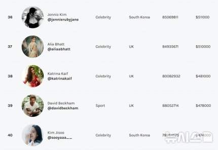 팔로워 8500만명을 거느린 제니는 36위를 차지했다. 그는 게시물당 최대 51만1000달러(약 6억8500만원)을 벌어들일 것으로 추정된다.