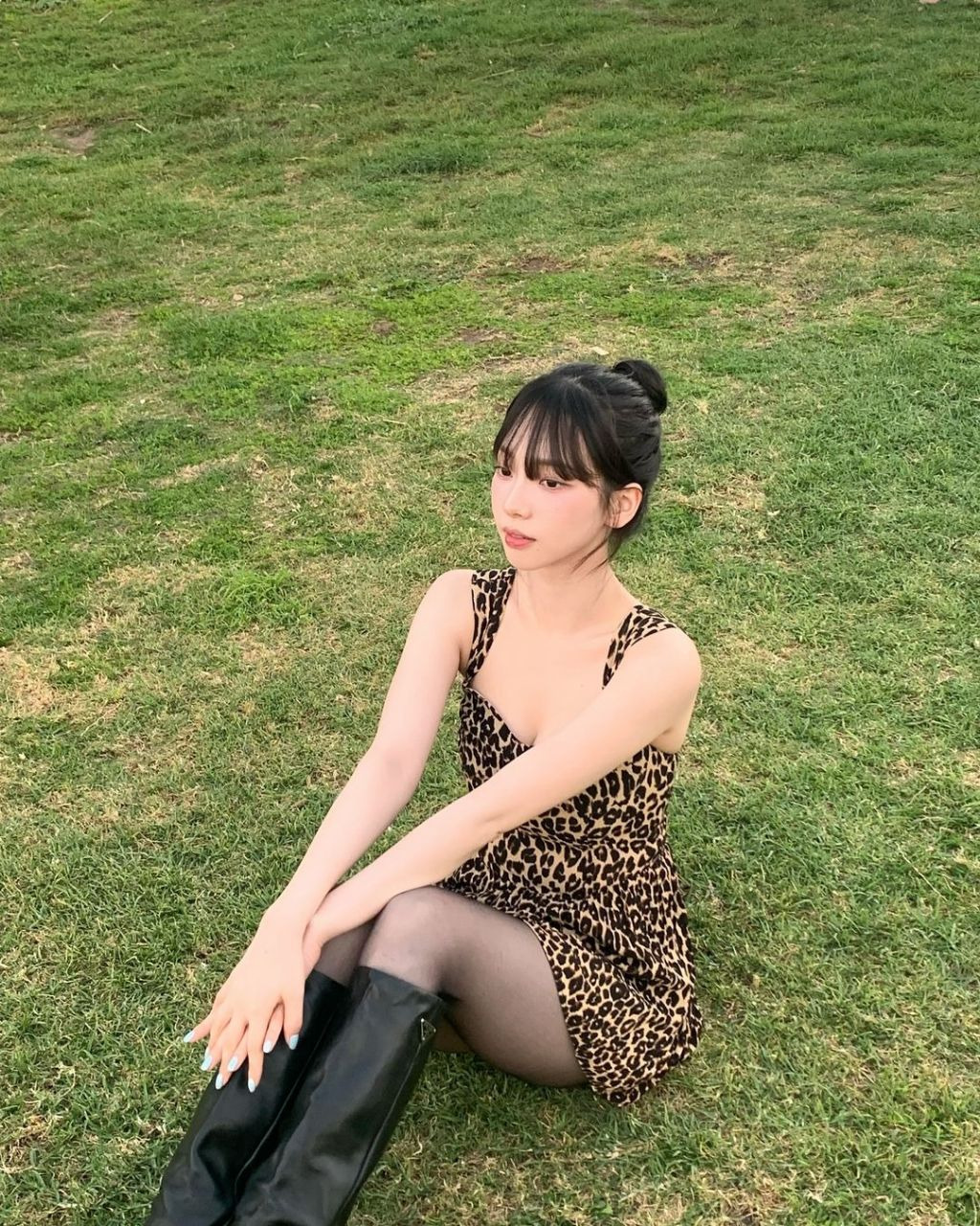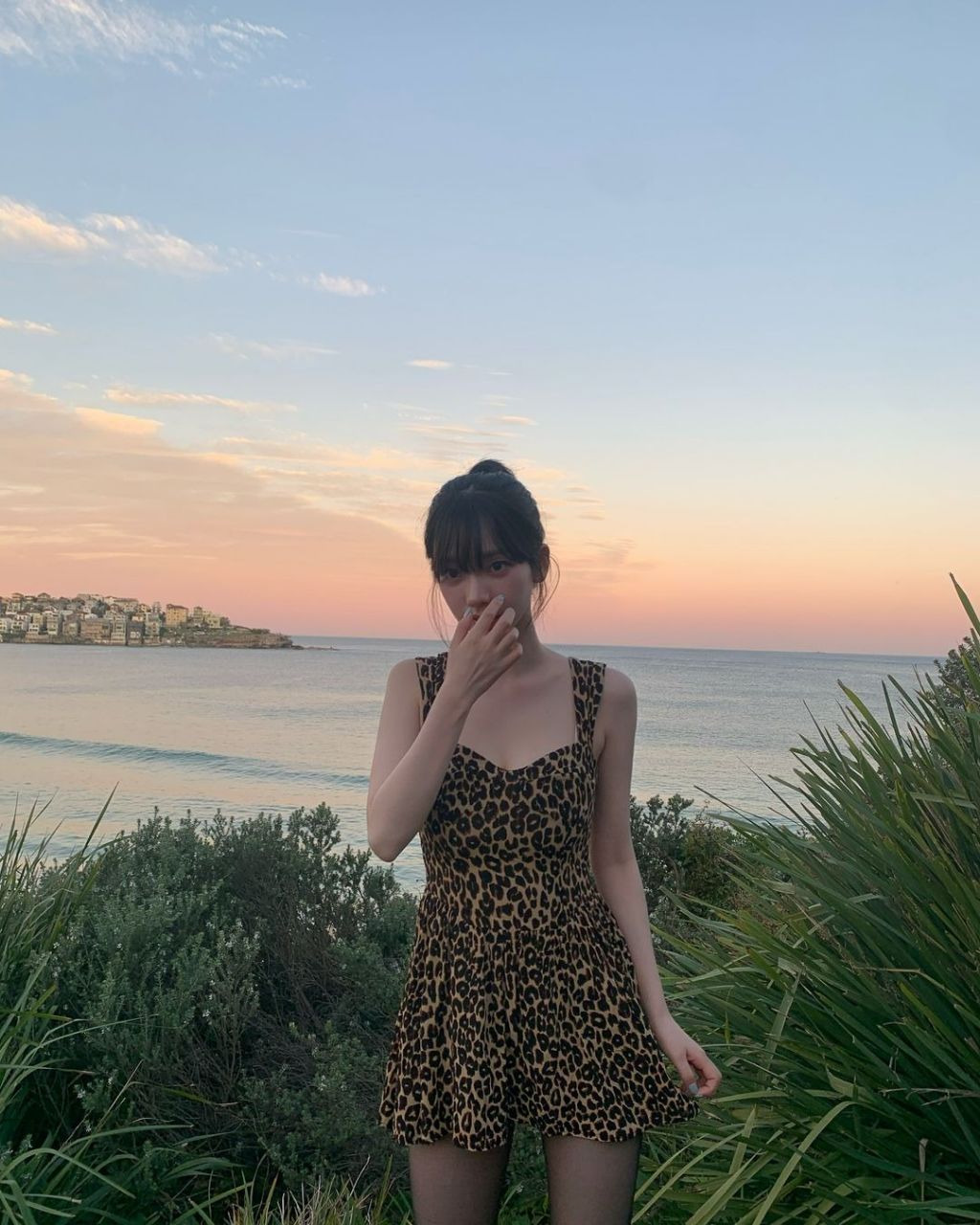 공개된 사진 속 카리나는 드넓은 잔디밭과 노을이 지고 있는 바닷가에서 다양한 포즈를 취했다. 호피 무늬의 민소매 원피스를 입은 카리나는 청순한 미모와 늘씬한 몸매를 자랑해 팬들의 시선을 사로잡았다.