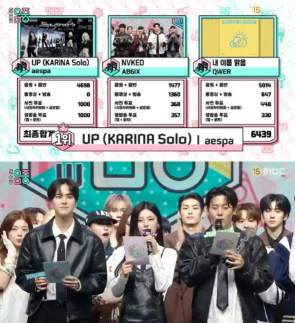 19일 오후 방송된 MBC 음악 프로그램 '쇼! 음악중심'(이하 '음중')에서는 에스파가 1위를 차지했다. 이날 10월 3주차 1위 후보로 에스파 'UP (KARINA Solo)', 에이비식스 'NVKED', QWER '내 이름 맑음'이 올랐다.