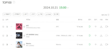 21일 오후 3시 기준, 국내 최대 음원사이트 멜론의 TOP100에서 1,2,3위를 걸그룹 블랙핑크의 로제, 에스파 카리나, 블랙핑크 로제가 각각 차지하면서 또다시 여자 솔로 붐을 일으켰다.