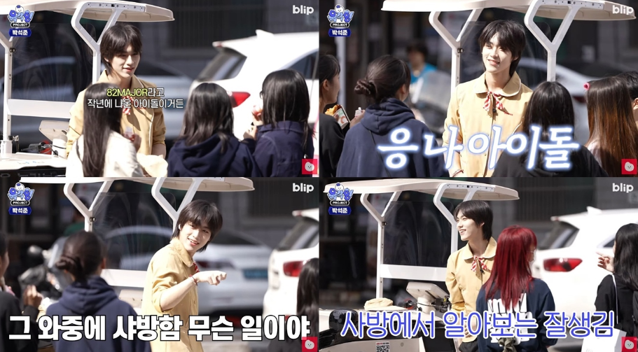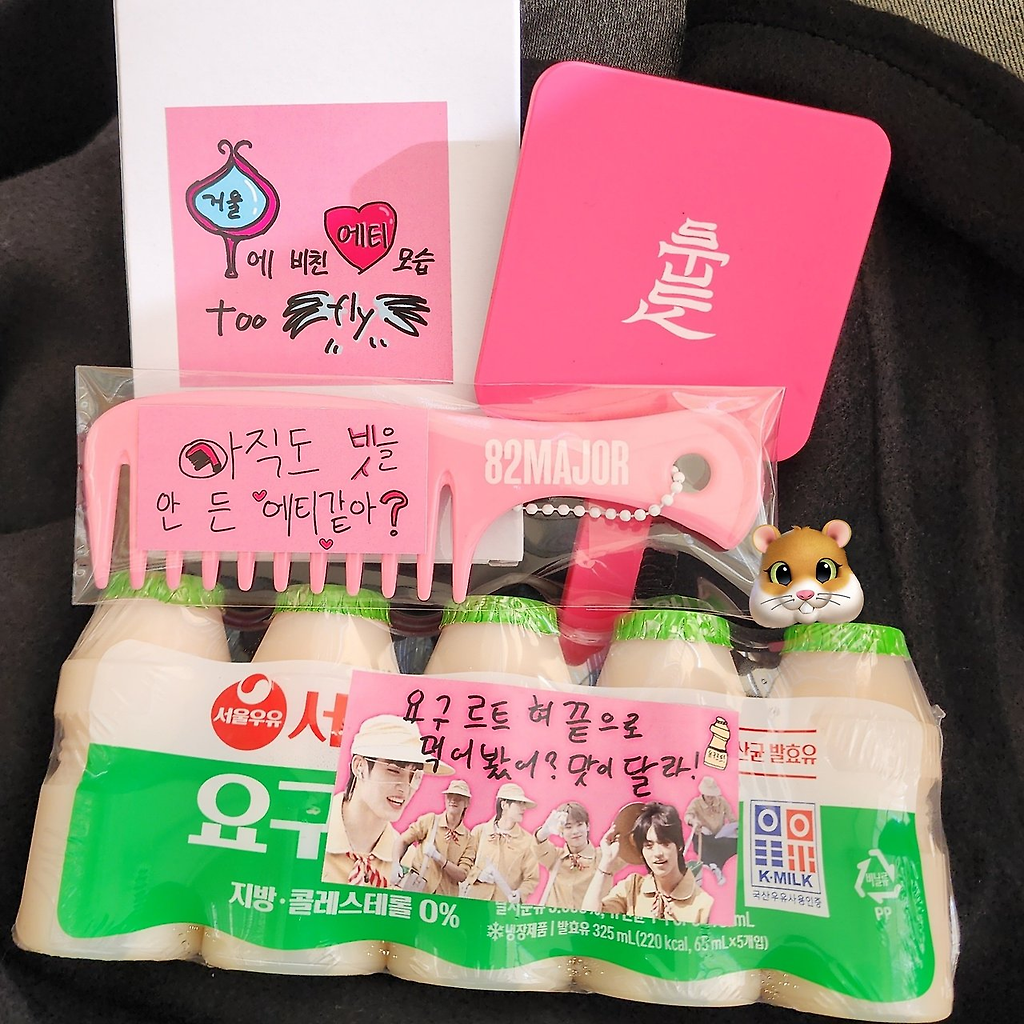 (혀끝 뮤비에 나온 첩보 의상이고 석준이가 야쿠르트로 반응좀 와서 무려 5개짜리 한줄로 다 나눠줌🙏🙏)