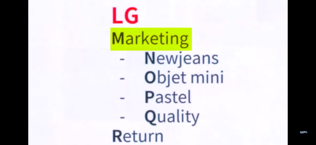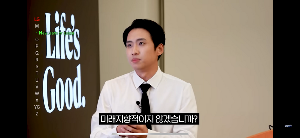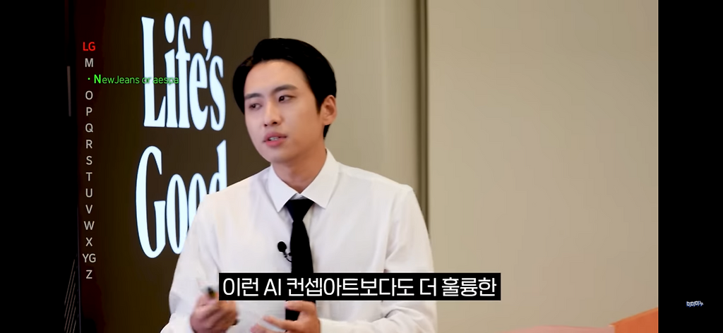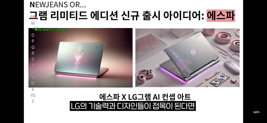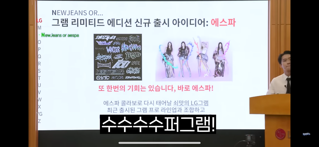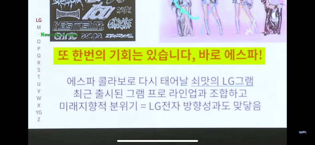 이앞 내용은 뉴진스와 콜라보를 해서 좋은반향을 일으켰고 최근 a사가 뉴진스에 접촉한다 그래서 그럼 LG는 다음 콜라보로 에스파 추천함