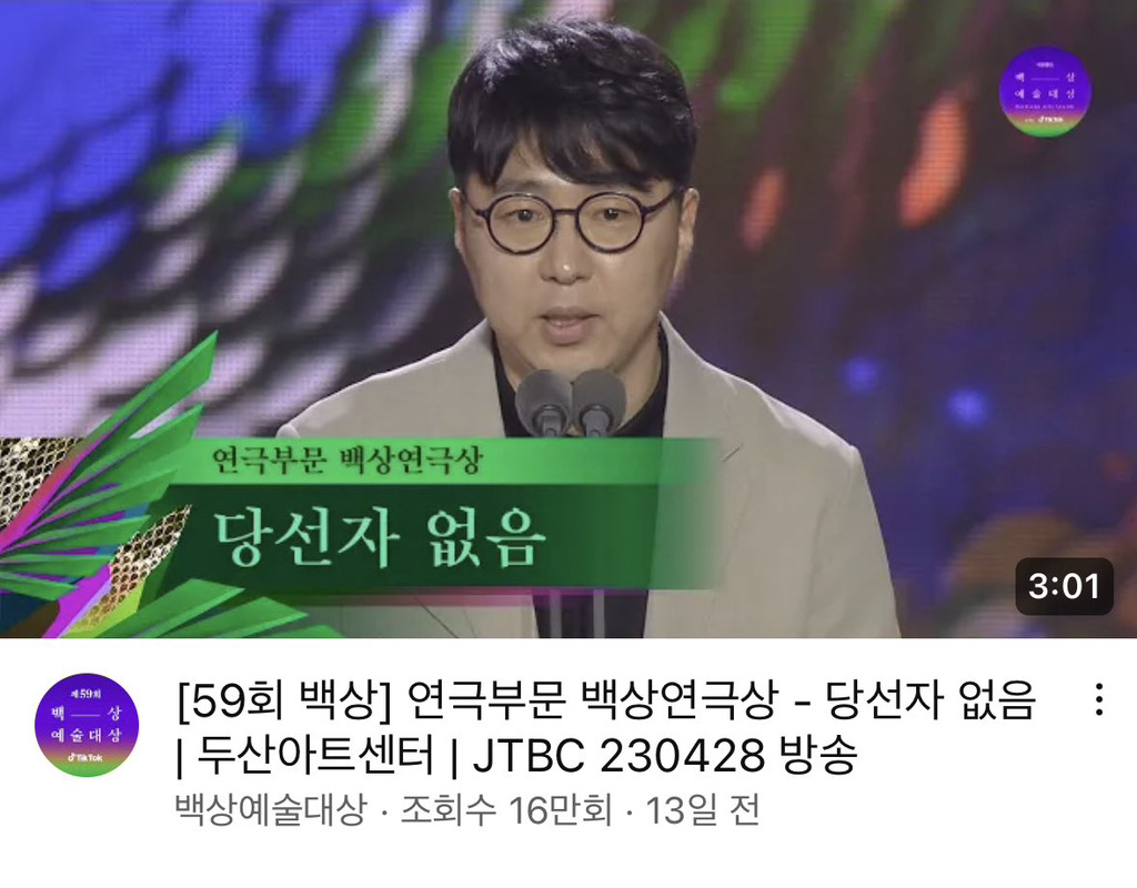 다들 당선될만한 작품이 없다고 아무도 안준 파격적인 장면인줄 알고 클릭해서 알고리즘 탄게 웃김 (연극 제목이 당선자 없음)