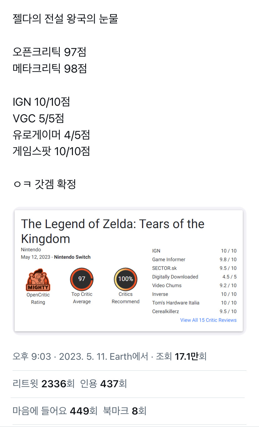 역사상 가장 높은 오픈크리틱 점수를 받은 게임 달성