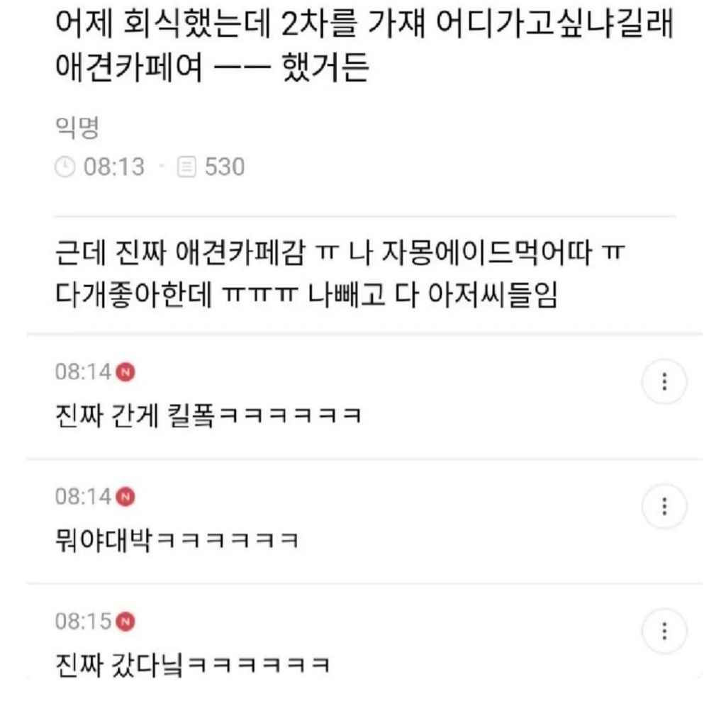어제 회식 2차로 어디가고 싶냐길래 애견카페 가자고 했거든