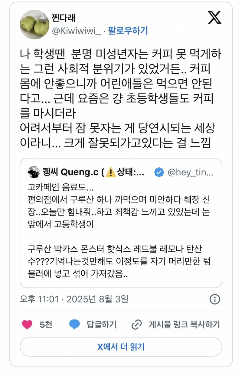 현재 서로 충격받고있는 커피 못먹게하는 사회 분위기