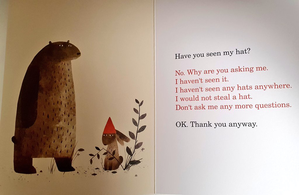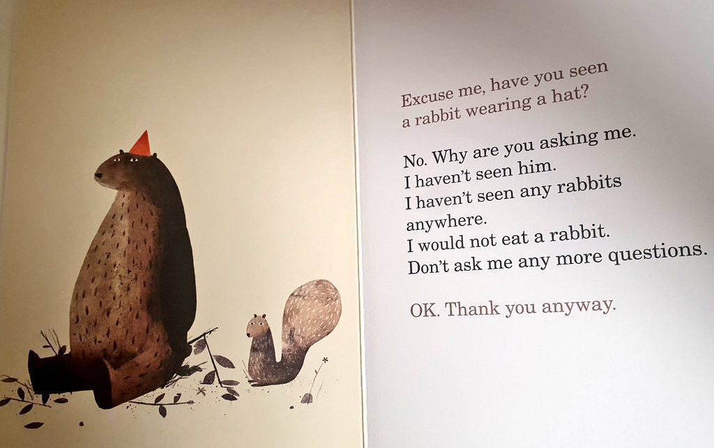 다람쥐:곰. 토끼 봤음?곰:ㄴㄴ 나 토끼 본 적 아예 없음다람쥐:ㅇㅋ대체..책 제목은 I want my hat back