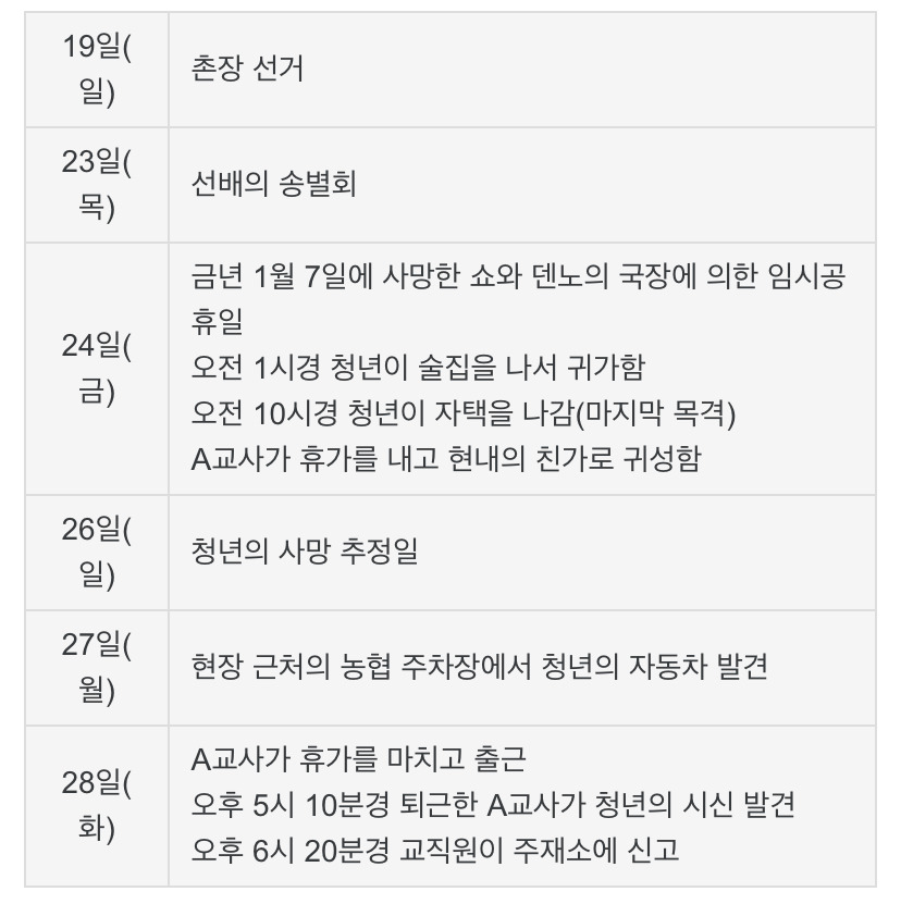 또한 시신을 발견한 A교사는 24일부터 27일까지 휴가로 같은 현의 친가에 가 있었고, 사망자와 A교사는 서로 지인 관계였기 때문에 휴가에 대한 정보는 죽은 청년이 이미 알고 있었을 가능성이 큼