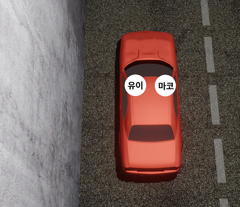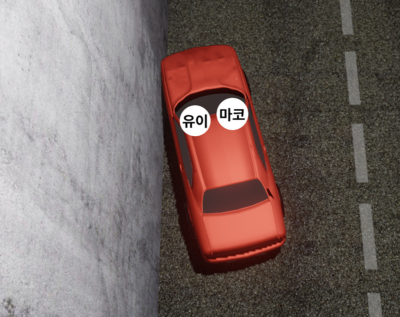 우케츠 : 차량은 우측 도로변에 충돌했습니다. 그런데 쿠라모토 사나는 좌반신에 중상을 입었죠.