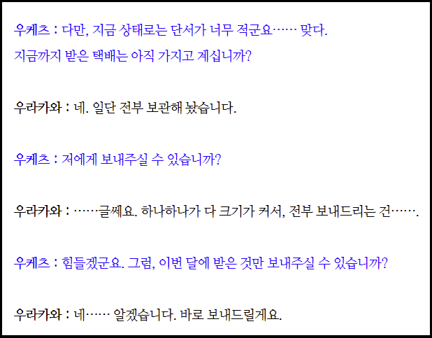 우케츠 : 제가 우라카와 씨에게 "8월에 온 택배를 저에게 보내주세요"라고 부탁드렸습니다.