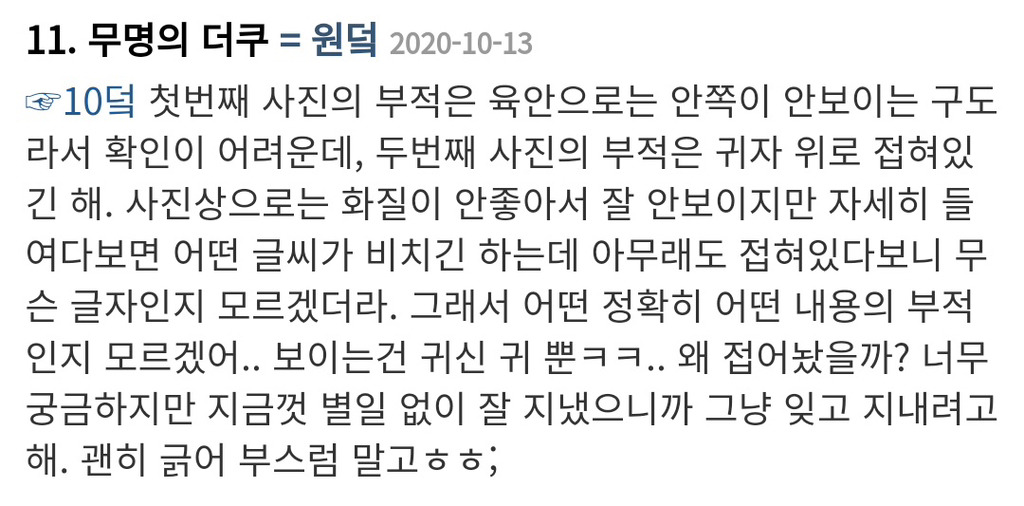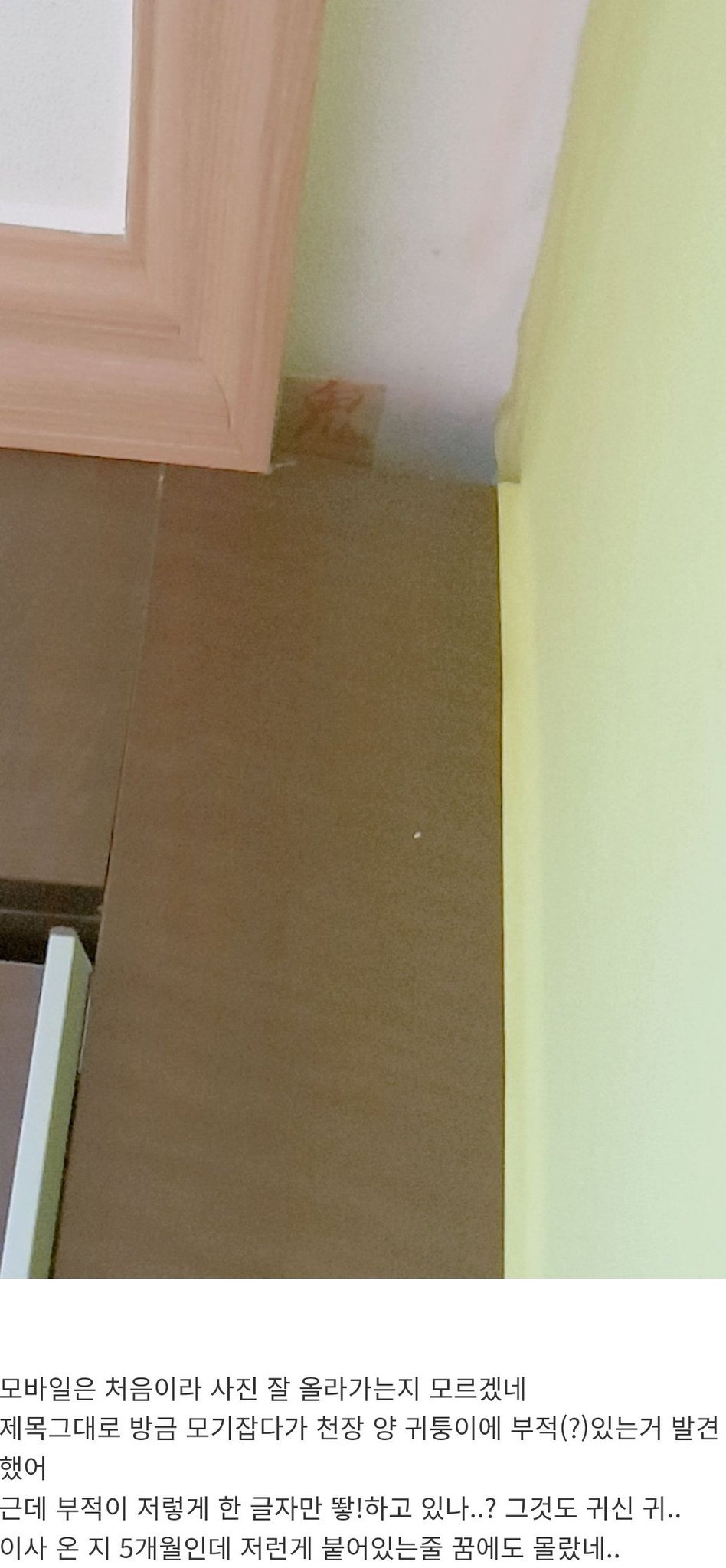 귀신 귀 자 한 자만 쓰여 있는 게 맞다면"이 집에 귀신 있(으니까 잡귀들은 이 집에 신경 끄는 게 좋)다"는 뜻의 액막이 부적이라고 함