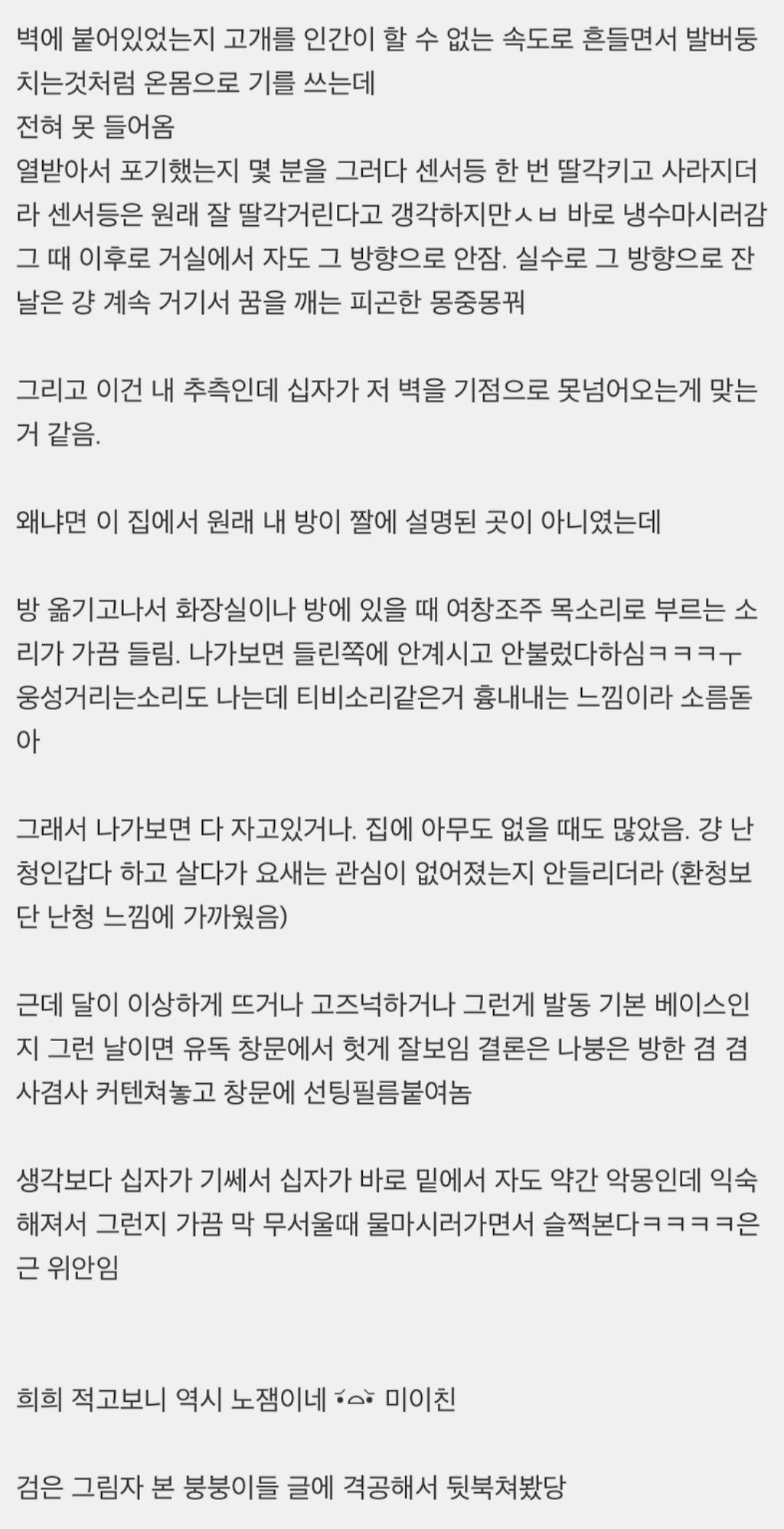 괴담 보면 검은 그림자 봤다는 애들 많잖아 나 가위도 안 눌리고 그런 쪽에 둔한 편인데 머리 크고나서 본 적 있음