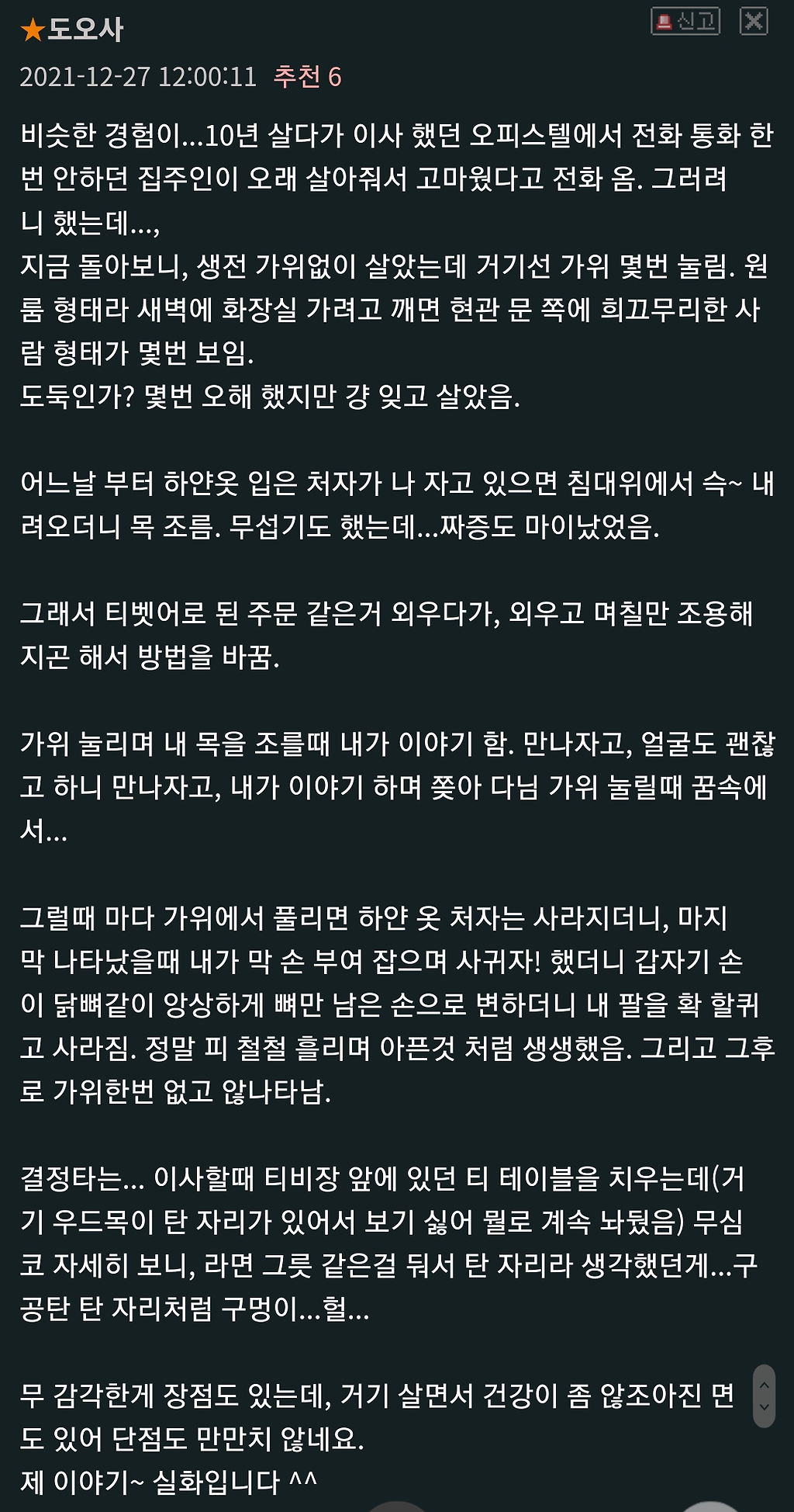 우리부부가 얼마나 무신경했냐면. 무섭다는 생각은 안들고 둘이서 농담***나 하면서 우리집에 애기 귀신이 사는가보다며 낄낄거렸음.