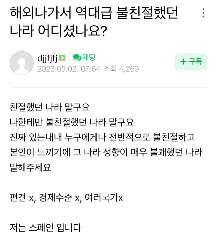 해외나가서 역대급 불친절했던 나라 어디셨나요?