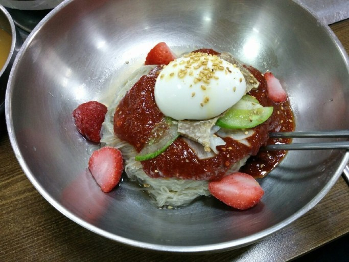 면 색깔도 딸기 육수도 딸기 토핑도 딸기. 상큼함과 시큼함 그 어딘가를 배회하는 딸기냉면VS