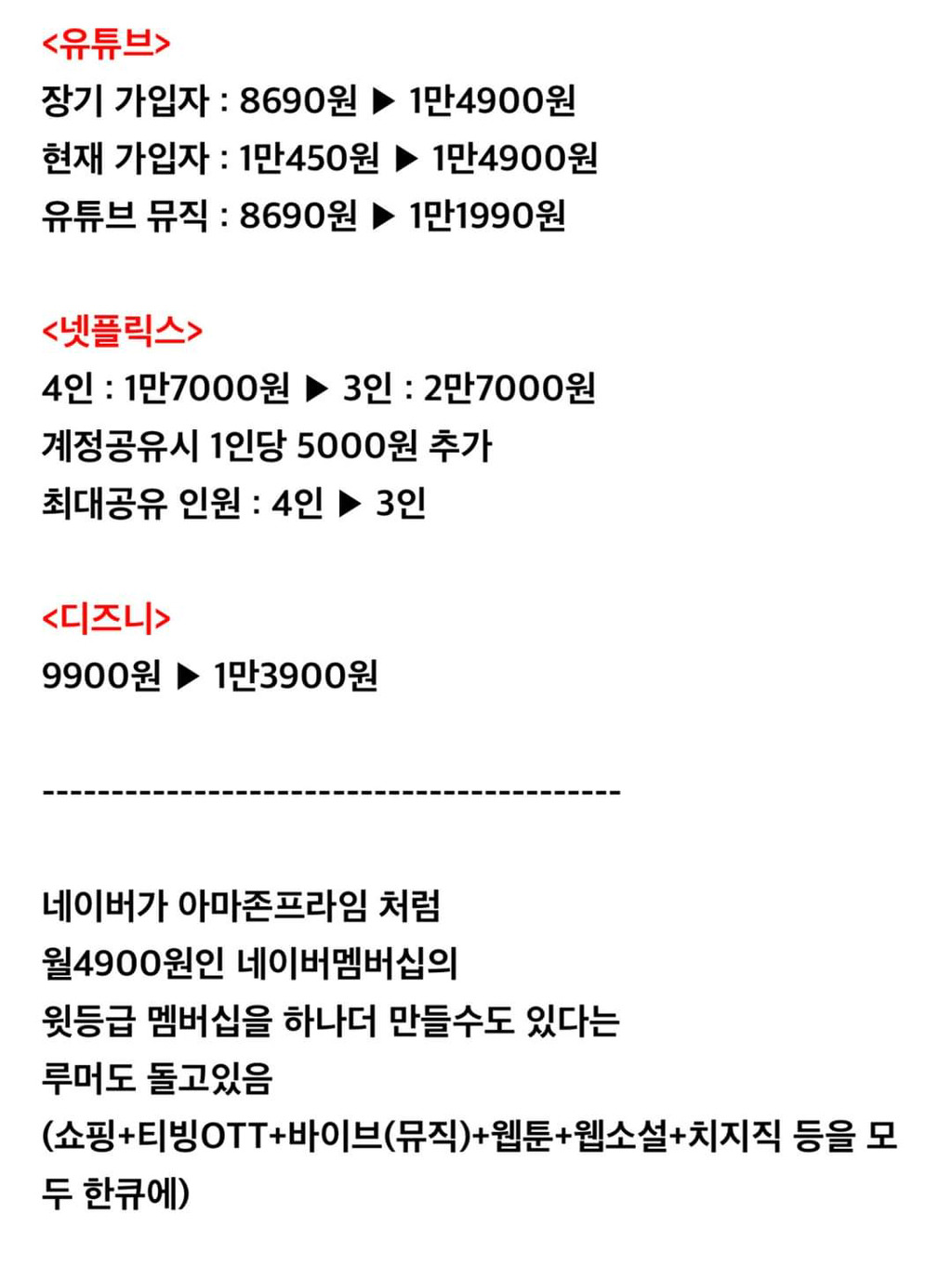 유튜브+넷플릭스+디즈니 가격 인상안 정리