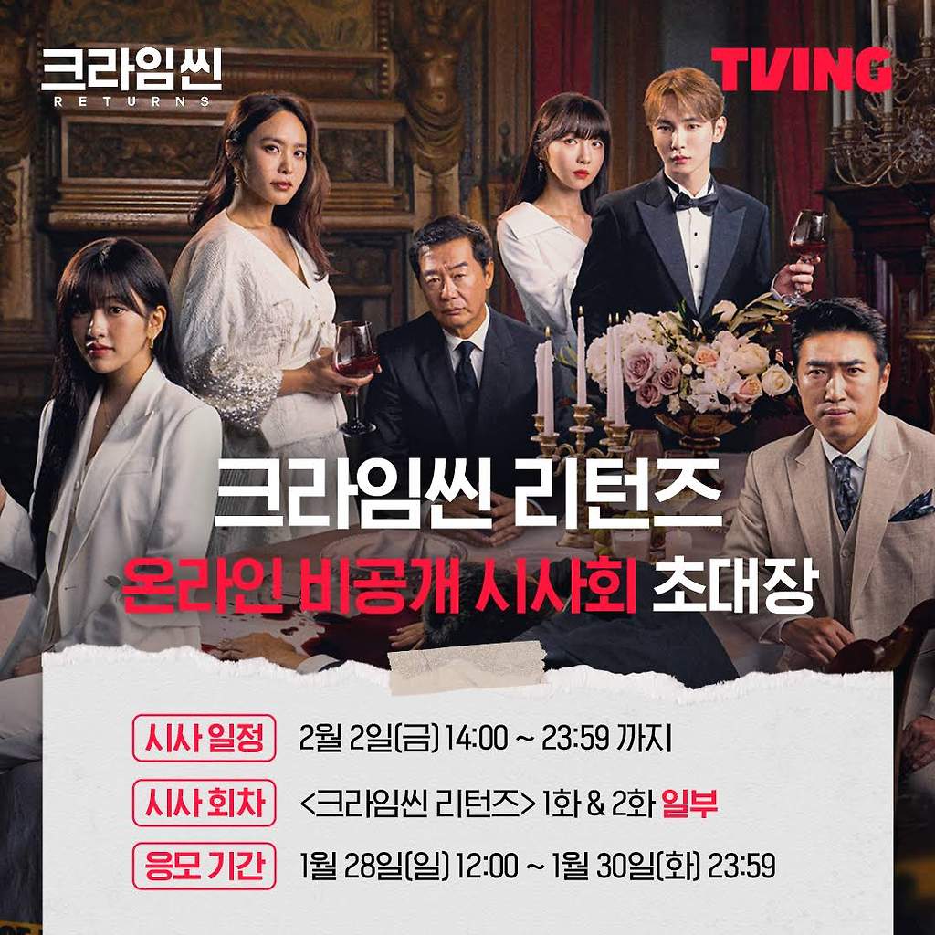 ※ 본 시사회 관련 스포일러성 내용을 외부에 유출할 경우 추후 이벤트 참여에 불이익이 있을 수 있습니다. 롤플레잉 추리 게임 <크라임씬 리턴즈> TVING 2월 9일 독점 공개