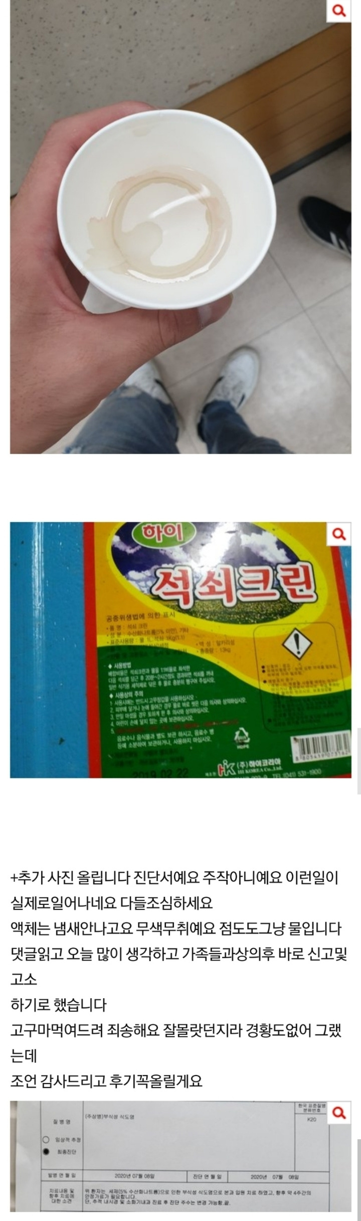30분정도가 지체되고응급실통해 진료를보게됬는데 후두경검사를햇더니 식도가 기도를덮어 조금더 부을경우 목숨위태할수있다며 인공기도삽관을해야할수도있다고그랬어요 그때 고깃집에서 사진을보내줫어요 이세제라면서 '석쇠크린'이라는명칭의세제였어요 세제사진을얻은가족들은 의사에게보여주고 수액과각종검사를하면서 치료를받았죠 그런데..의사가 와서말하길