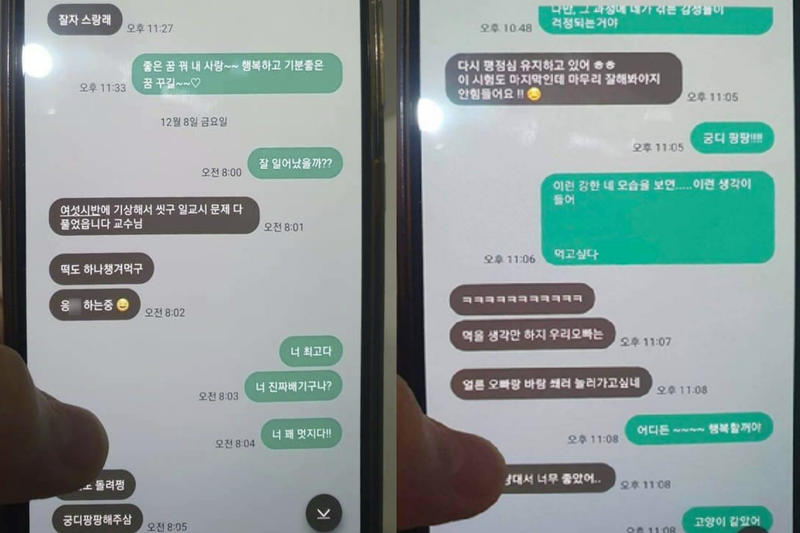 대화 내용을 보면 늦은 밤 교수가 학생에게 "좋은 꿈 꿔 내 사랑"이라며 애정을 드러내고, 학생도 교수를 '오빠'고 부르는 등 무척 애틋한 모습을 보여줍니다. 학생이 자신의 엉덩이를 토닥여 달라고 애교를 부리자, 교수는 성적인 농담을 건네기도 합니다.