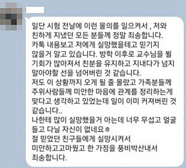 이 메시지는 교수의 아내가 학과 단체 채팅방에 폭로하면서 알려졌습니다.