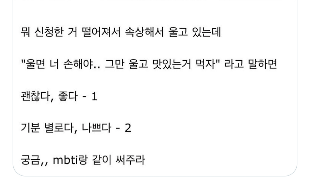 울면 너만 손해야 < 이것만 말했으면 짱나는데 뒤에 맛있는거 먹자~~ 이렇게 위로도 해줘서 괜찮은듯난 infp enfp 번갈아가면서 나옴ㅋㅋ