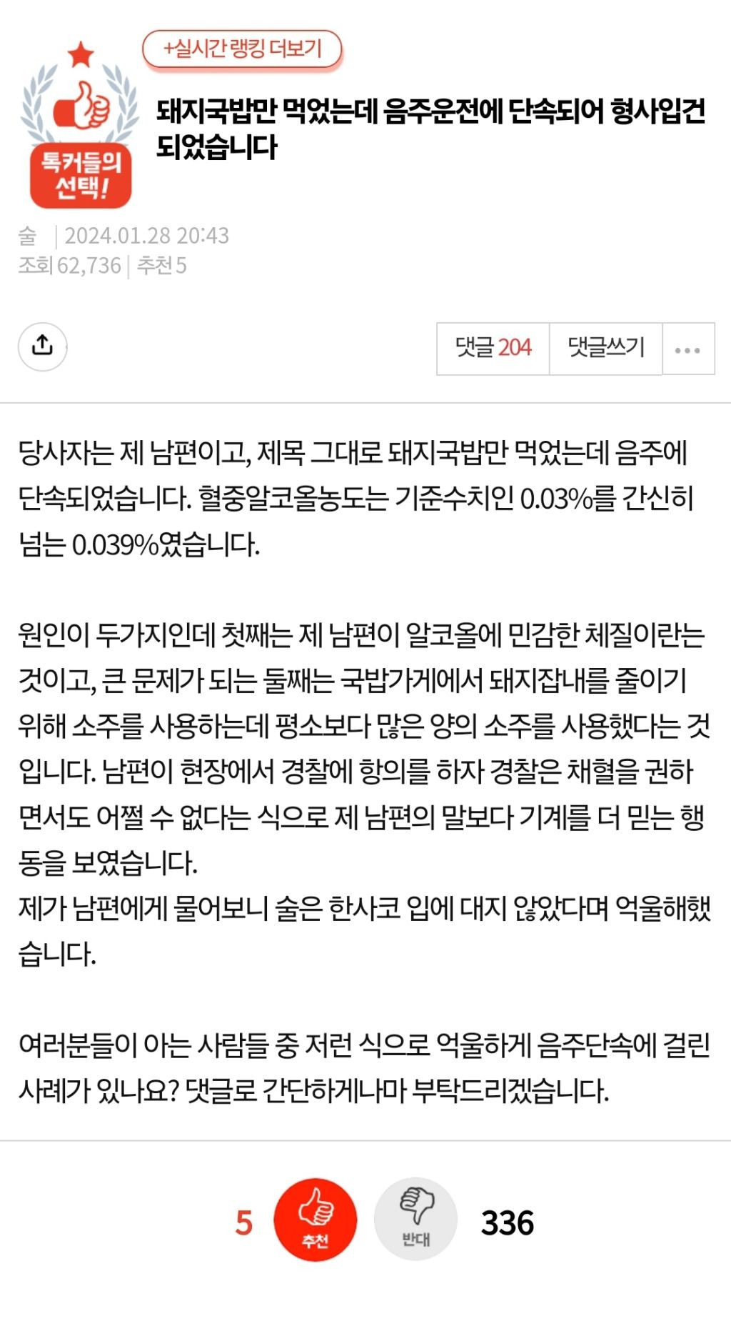 돼지국밥만 먹었는데 음주운전에 단속되어 형사입건되었습니다
