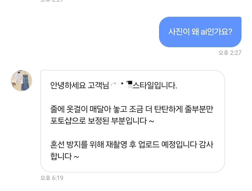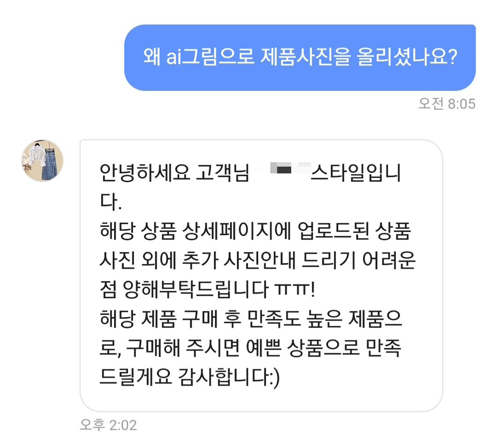 이제 옷도 사진 안찍고 ai로 이미지 만들어서 올림사진 보면1. 옷걸이 공중부양2. 나무탁자에 다리 없음> 빼박 ai상세보기에실샷이나 착샷 첨부도 없음걍 싹 다 ai 이미지뿐+지금은 해당 상품 다 내려감쇼핑몰측 답변