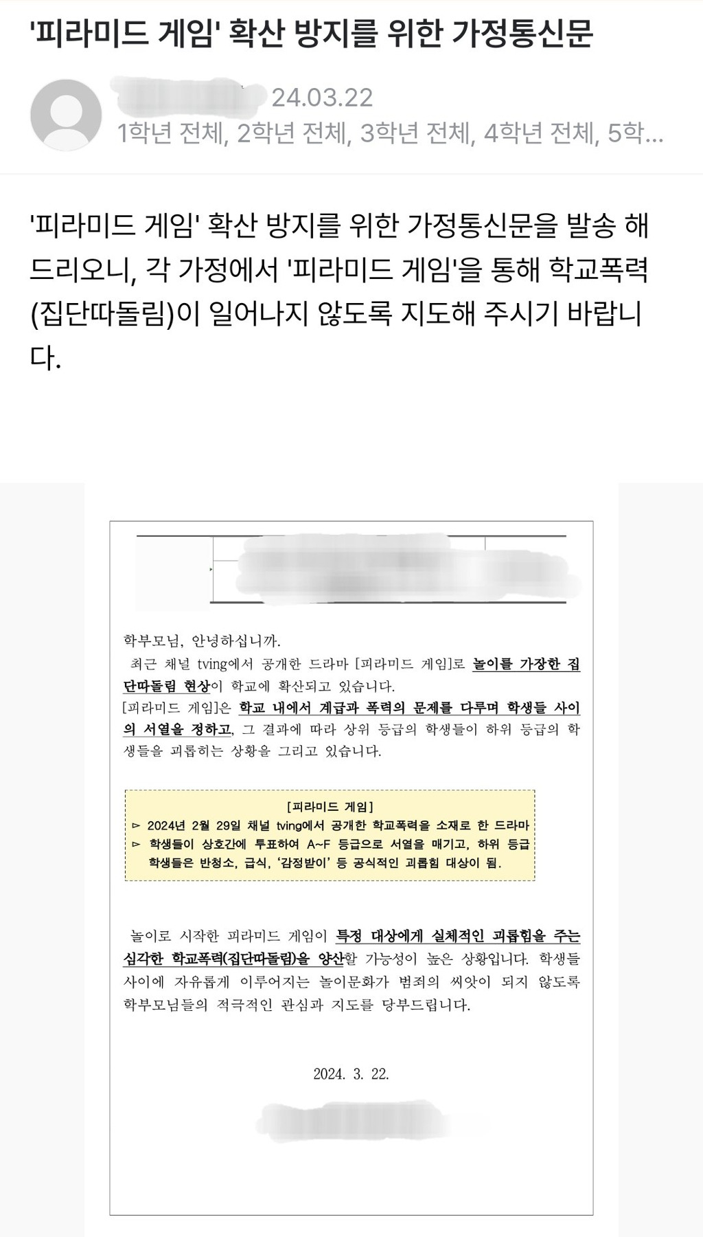 최근 학교에서 주의 공문 보내고 있는 피라미드 게임