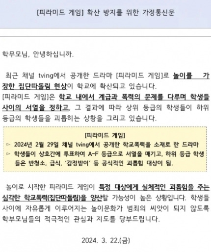 드라마 ‘피라미드 게임’ 공개 이후 놀이를 가장한 집단따돌림 현상이 학교에 확산중