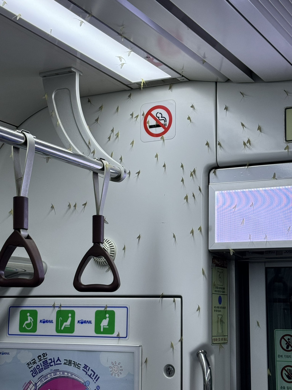 2급수이상맑은물에 서식하는 동양하루살이가열차 점령함….그래서 그런지 좌석이 많이 비어있음 😖한강이 깨끗해져서 나오는 거긴 한데원래 6-7월 많이 나옴 <문제는 아직 5월임….+생긴게 좀 그렇지 해충은 아니라고 함(입이 퇴화해서 물지도 않음)그냥 번식력이 강력할 뿐……….