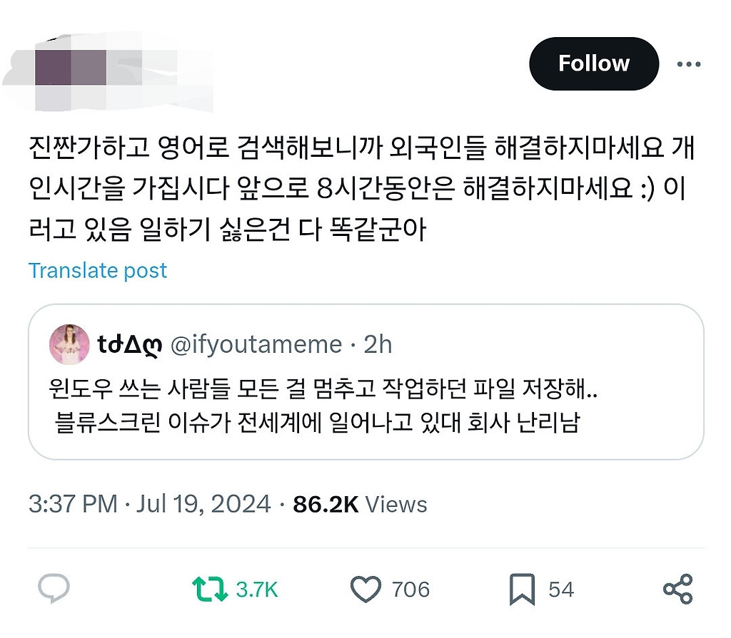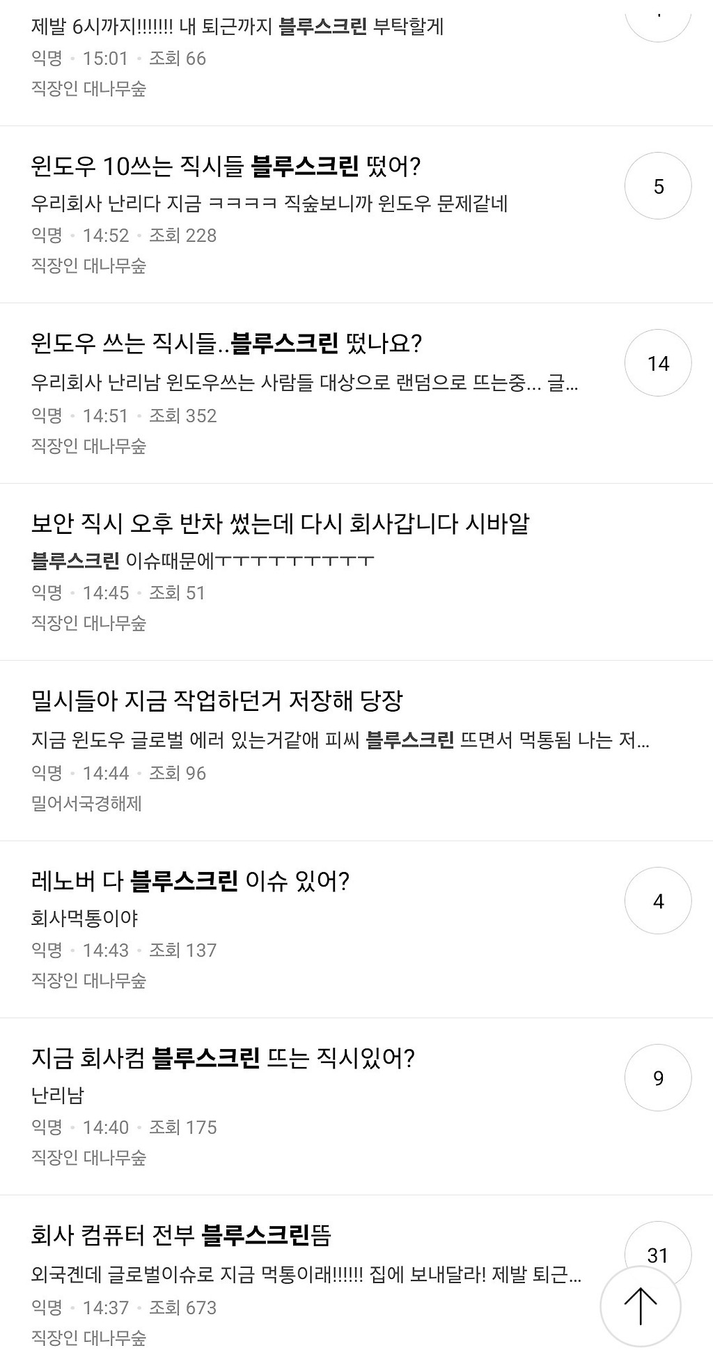 직숲(직장인게시판)도 트윗 올라온 시간과 비슷한 때부터 블루스크린 때문에 난리남