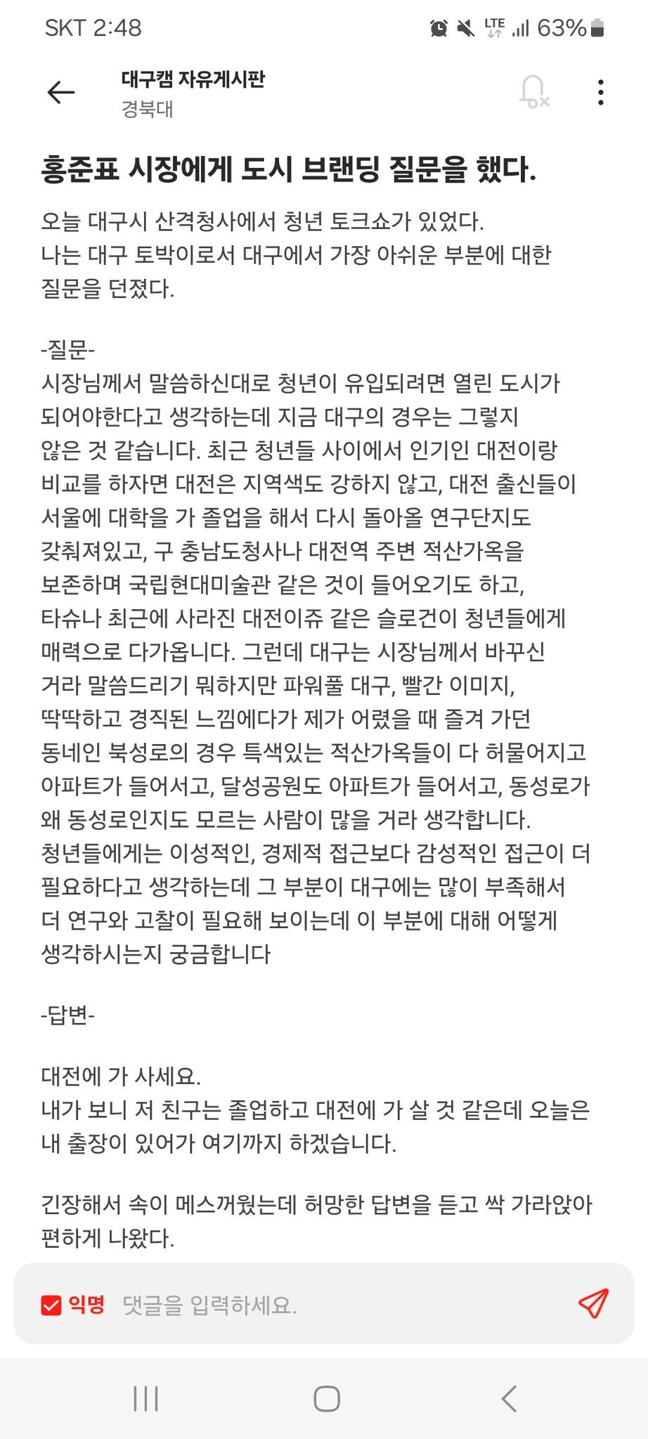 경북대 학생이 대구시장에게 대구 도시브랜딩에 대해 질문하고 받은 답변