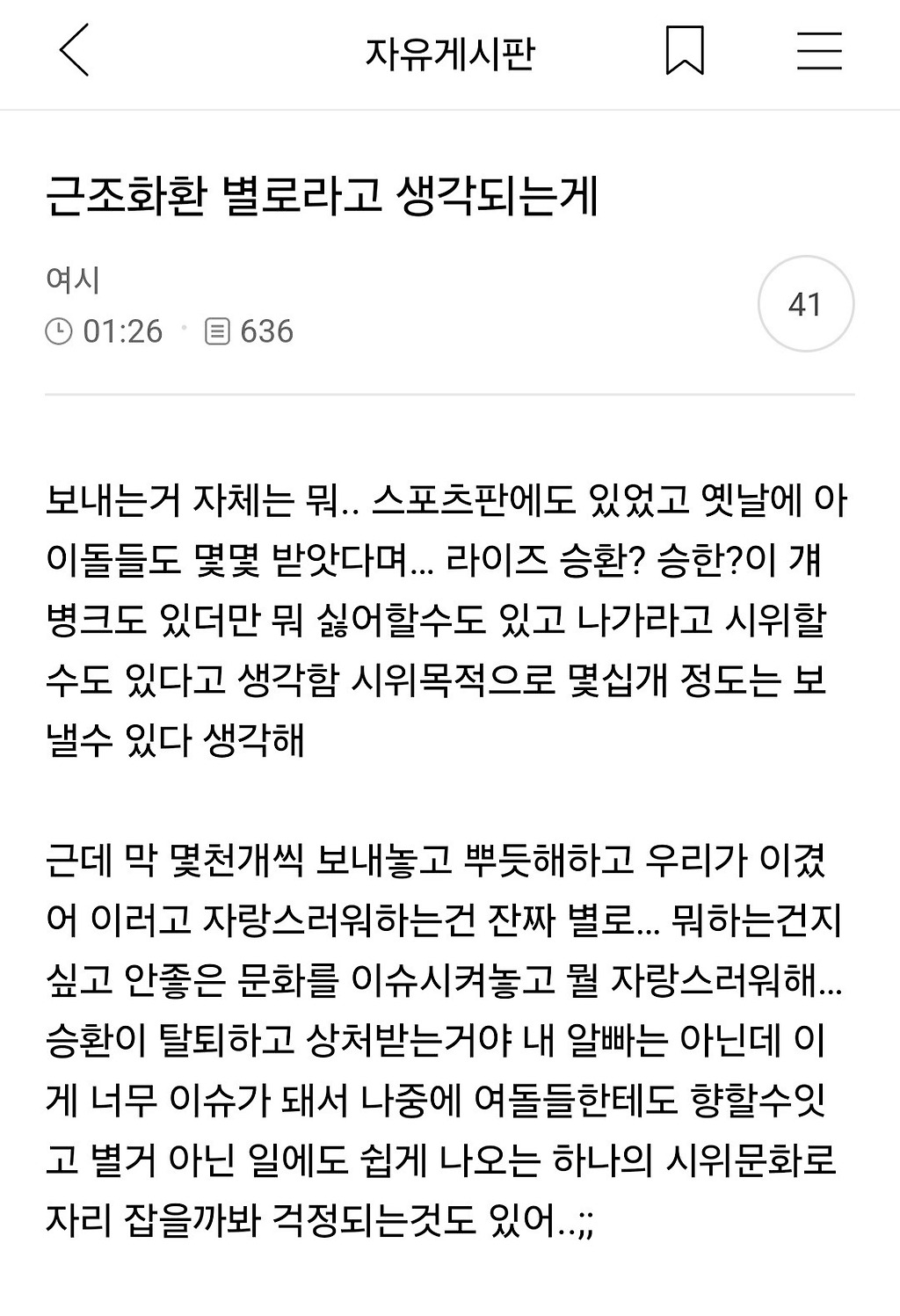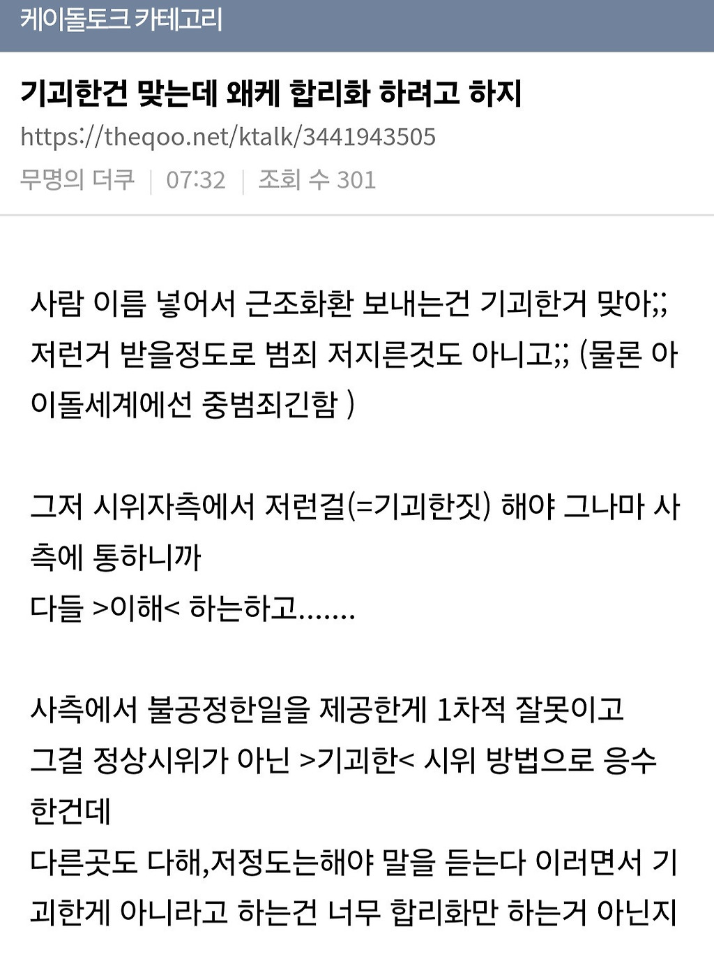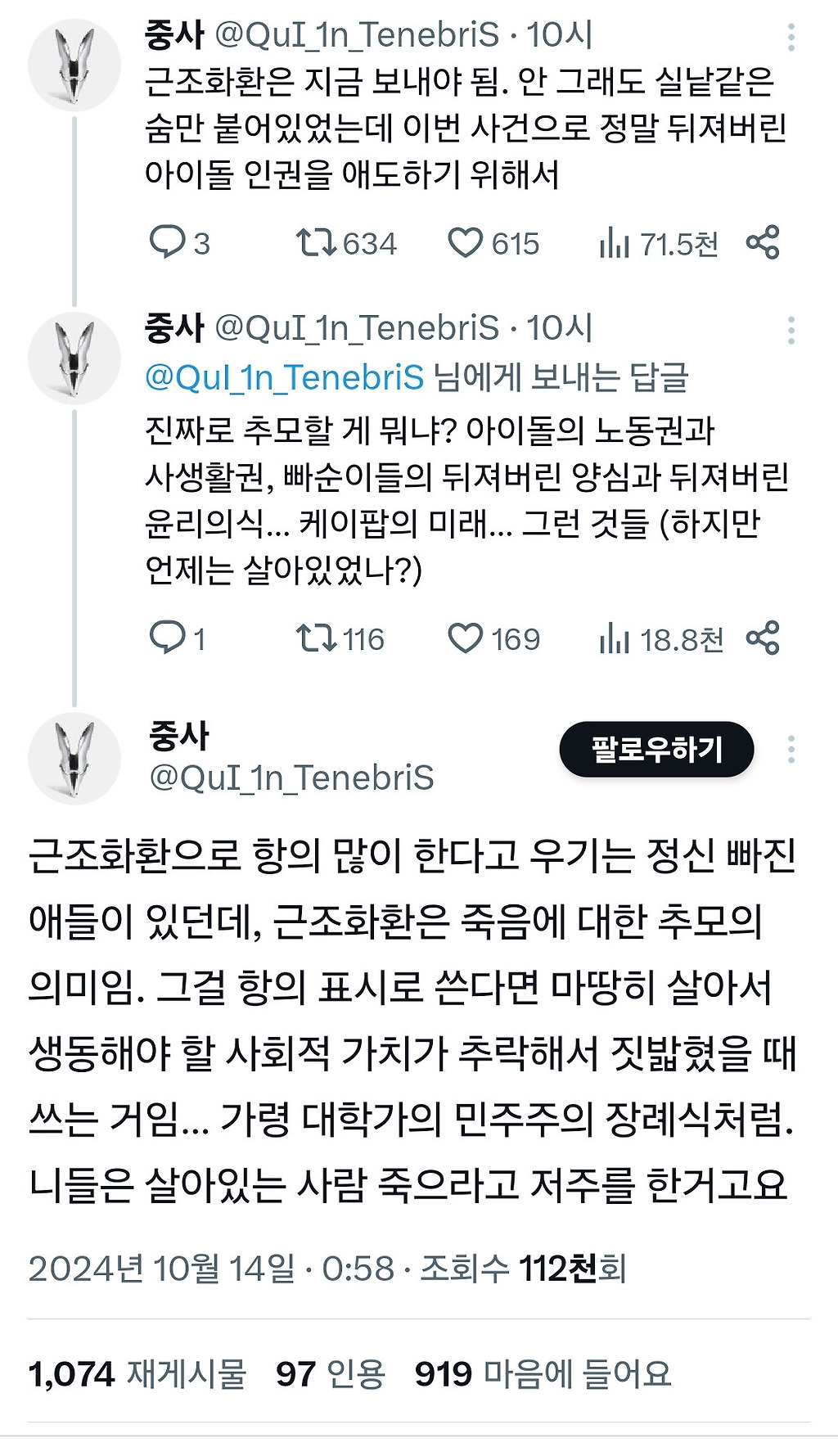 아무리 정치판, 스포츠판 등에서 쓰이고 있었다고 해도 근조화환이 가지는 의미가 있는데 멤버 한 명 겨냥해서 몇 백개씩 보내 압박하는 방식은 기괴 그자체임 사회의 정의를 위한 것도 아니고...