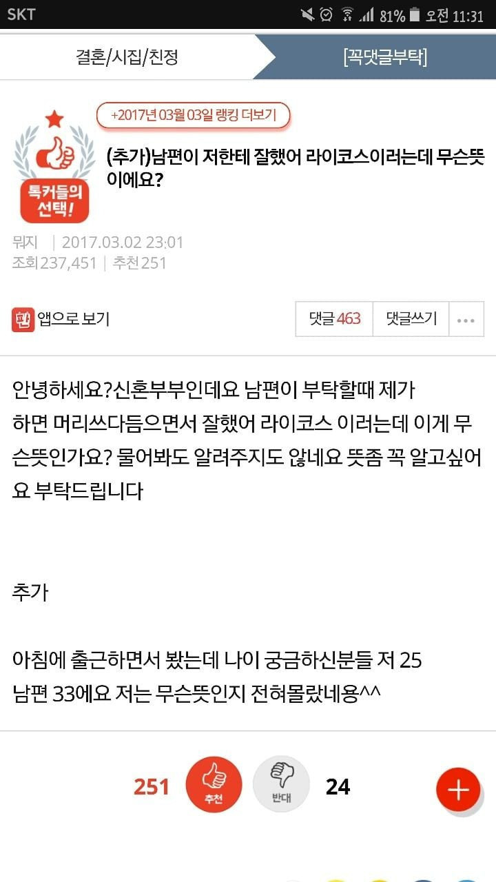 남편이 저한테 머리 쓰담쓰담 해주면서 잘했어라이코스~ 이러는데 무슨 뜻이죠?